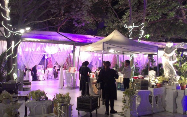 而於玻璃教堂旁的花園宴會廳,則以透明大型帳篷式設計,設備完善,冷氣開放,極富開放感,可延開最多二十席。晚宴時,與一眾賓客同處夜空之下,不稍稍抽離一下的話還不認得這裏仍是那繁忙的香港!